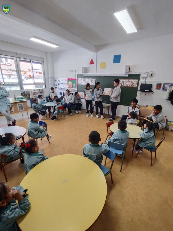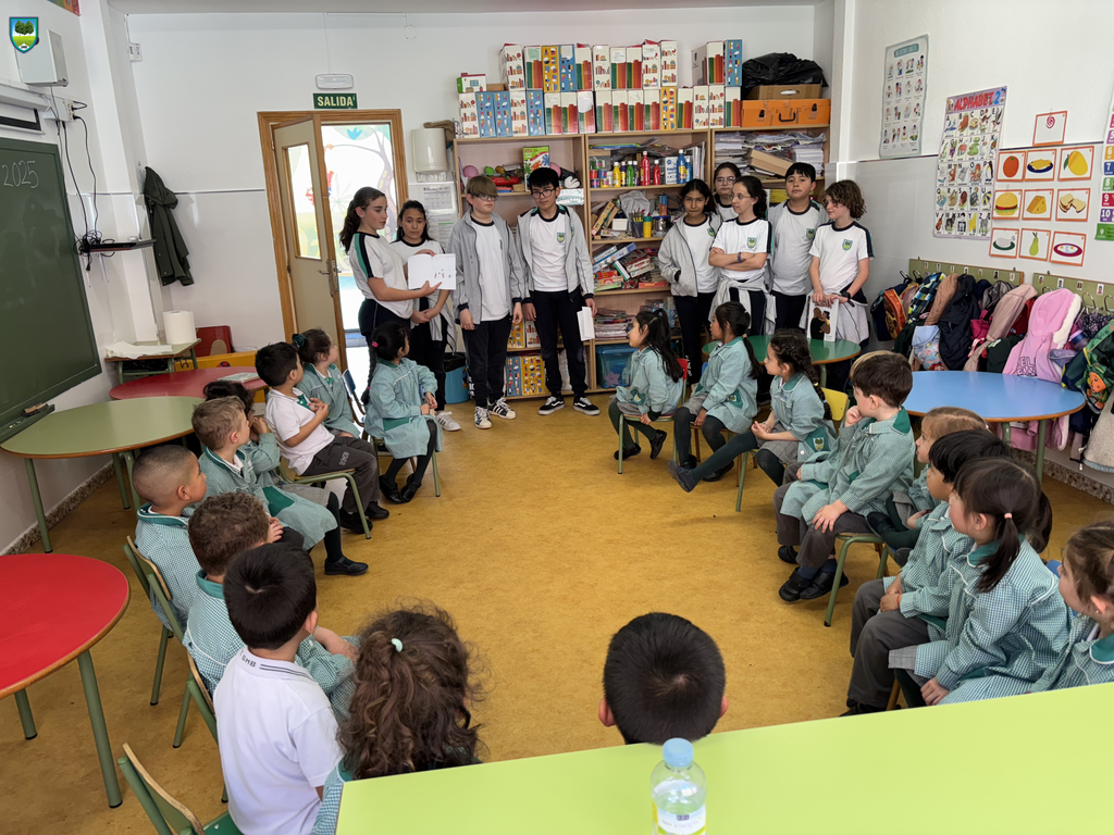 Durante las tardes del 23 y 24 de abril, los cursos mayores —4º, 5º y 6º de Educación Primaria— se convirtieron en cuentacuentos y monitores de actividades para sus compañeros más pequeños de Educación Infantil, 1º, 2º y 3º de Primaria.